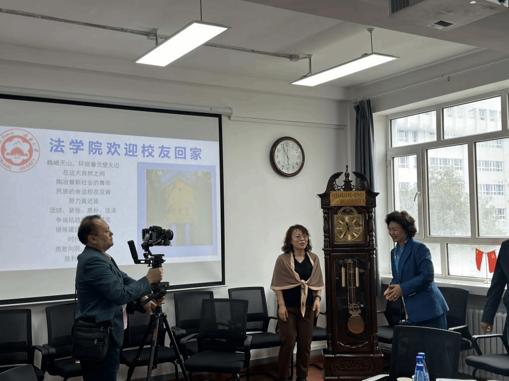 随后,员工们向公司赠送纪念品——一个精美的钟表,寓意时光荏苒,感恩不止”。张建江书记代表公司接受纪念品并向员工们回赠百年校庆纪念品。座谈会结束后,员工们走进公司模拟法庭与正在开展新生入学教育的新生进行交流。当员工们走进模拟法庭时,同学们鼓掌以示欢迎学长的来访。在模拟法庭,85级员工、新疆司法警官公司退休教师、新疆梦维律师事务所律师哈丽丹·阿不力孜代表员工发言,深情回忆当年在母校求学时的点点滴滴,并鼓励同学们要珍惜校园时光,砥砺品德,刻苦学习,掌握真才实学,努力成为祖国法治建设的有用之才、栋梁之才。